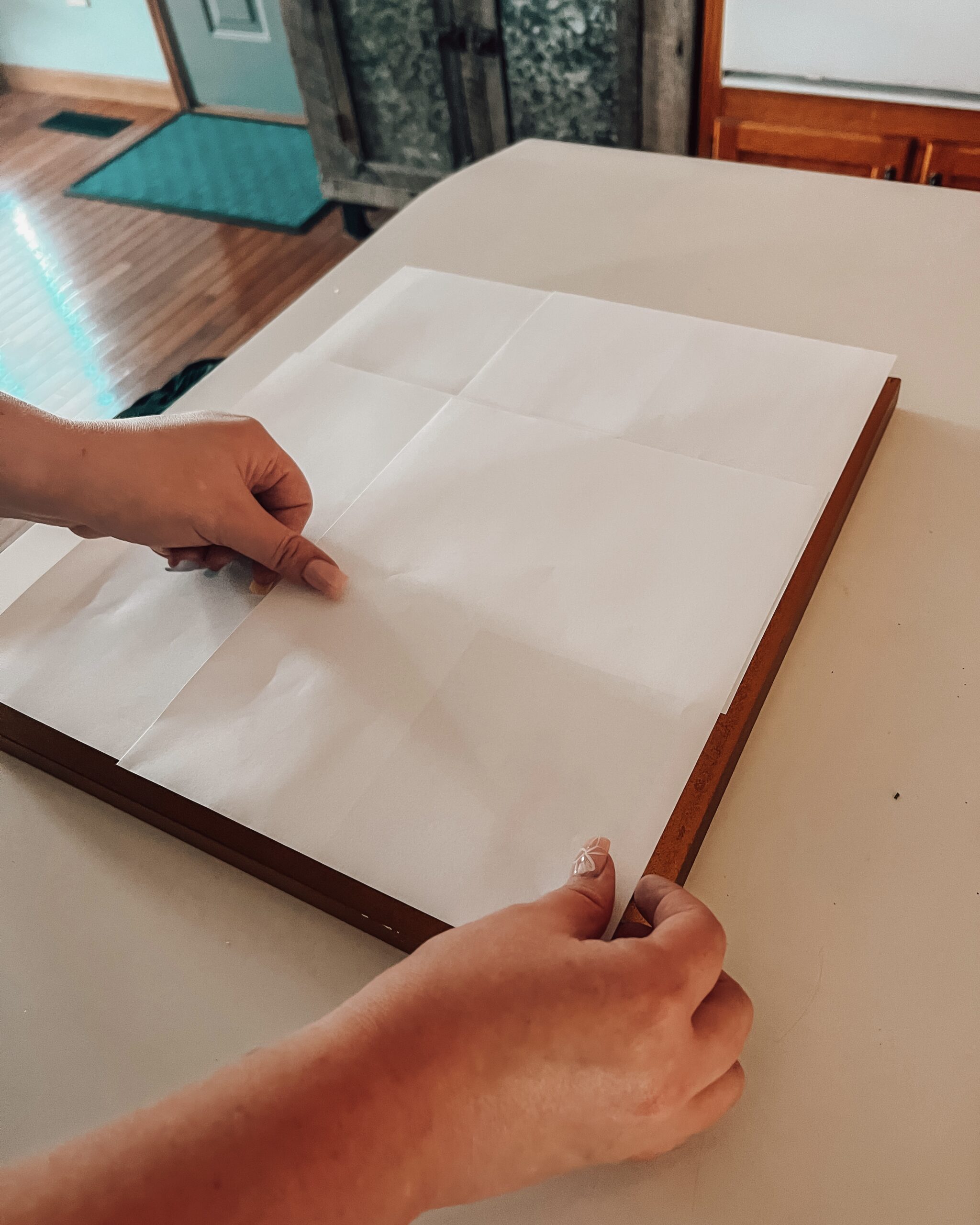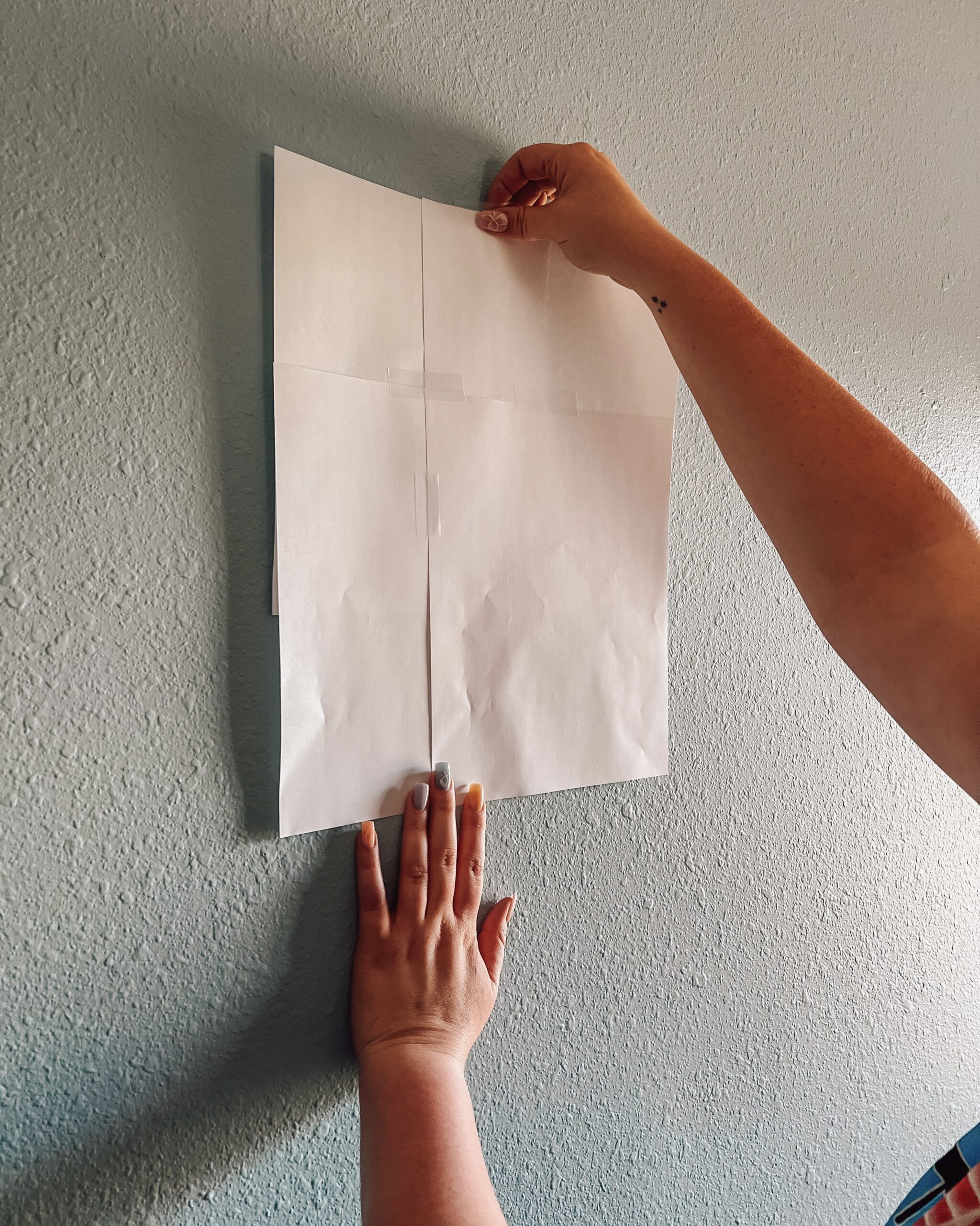 Step 3: Purchase some printer paper if you don’t already have some and outline your frames by layering the paper and taping the pieces together. Use more tape (or nails if you plan to hang your frames instead of using command strips) to place them on the wall. You can even label the cutouts to help you see where things will hang on the wall. This will help you to make sure everything will be placed evenly and that everything will fit where it needs to be.