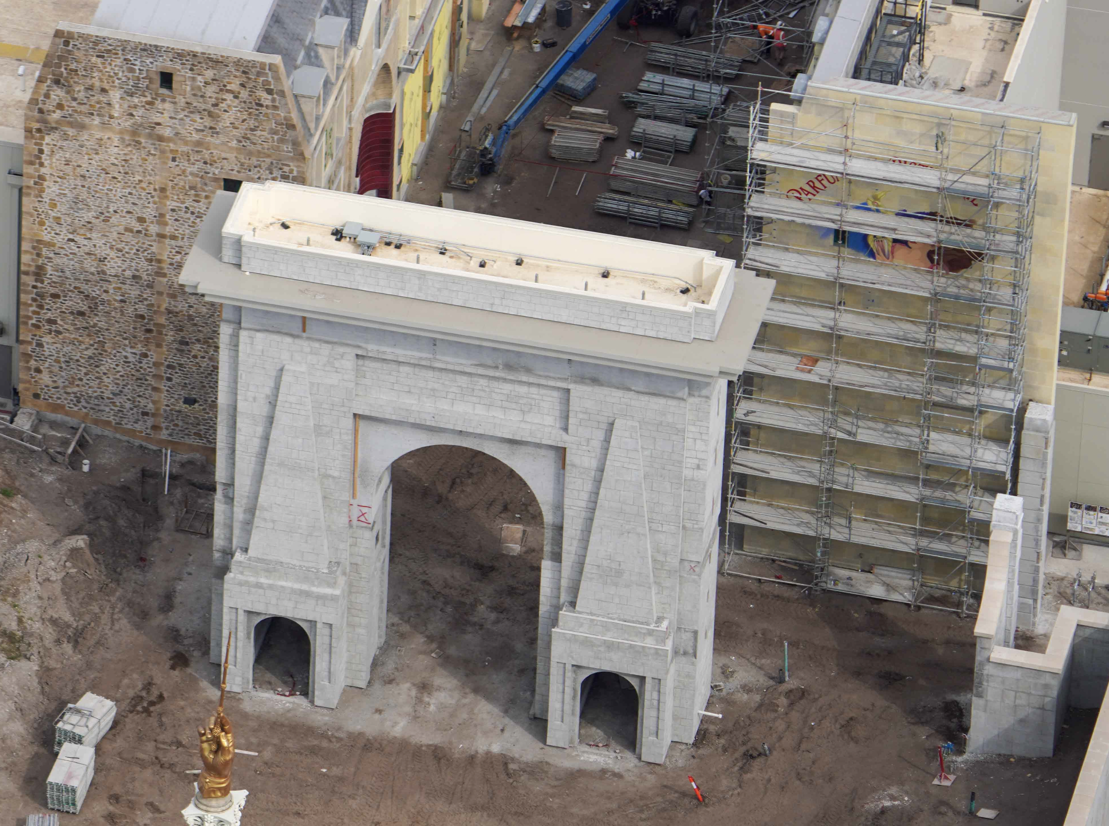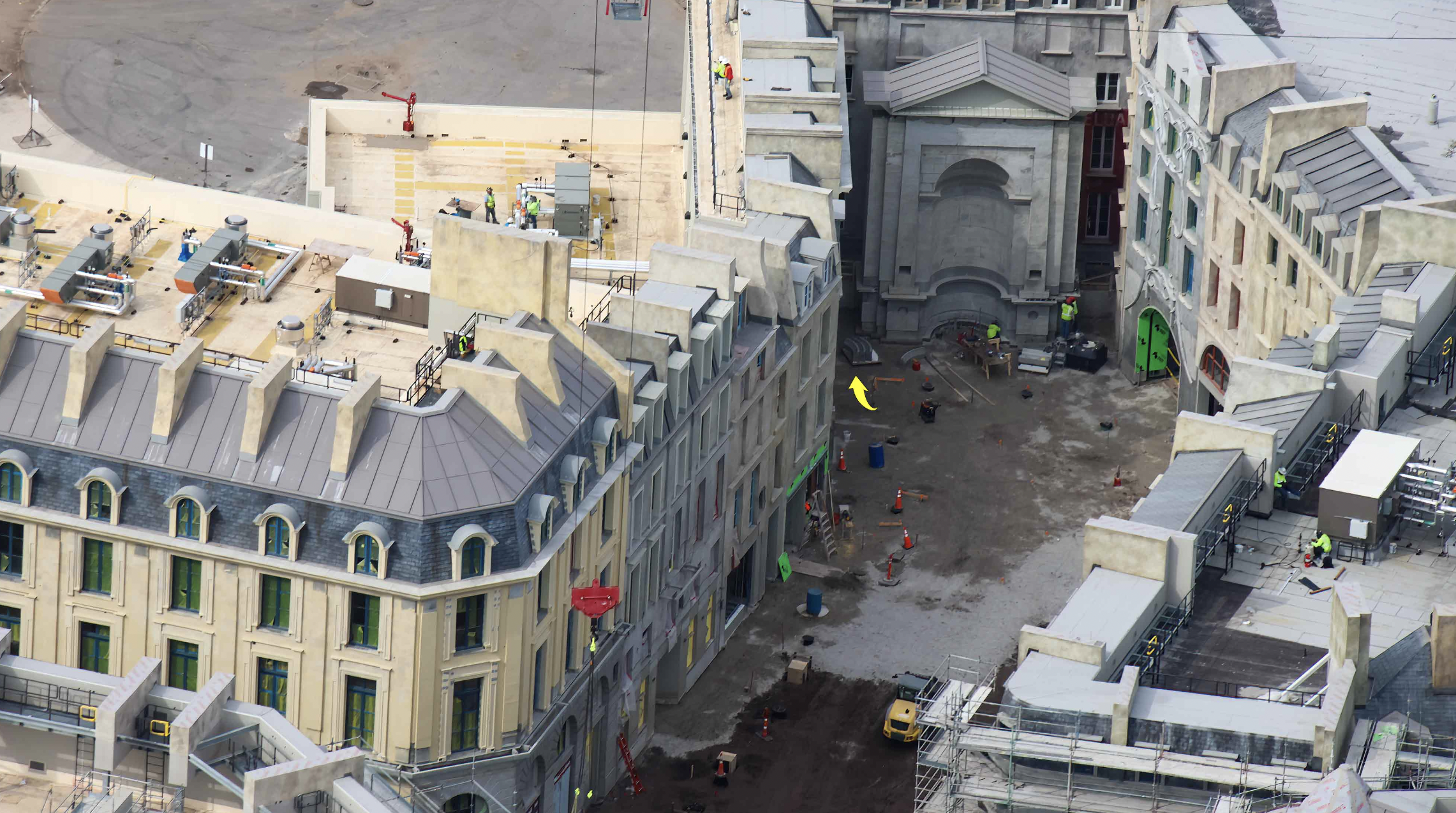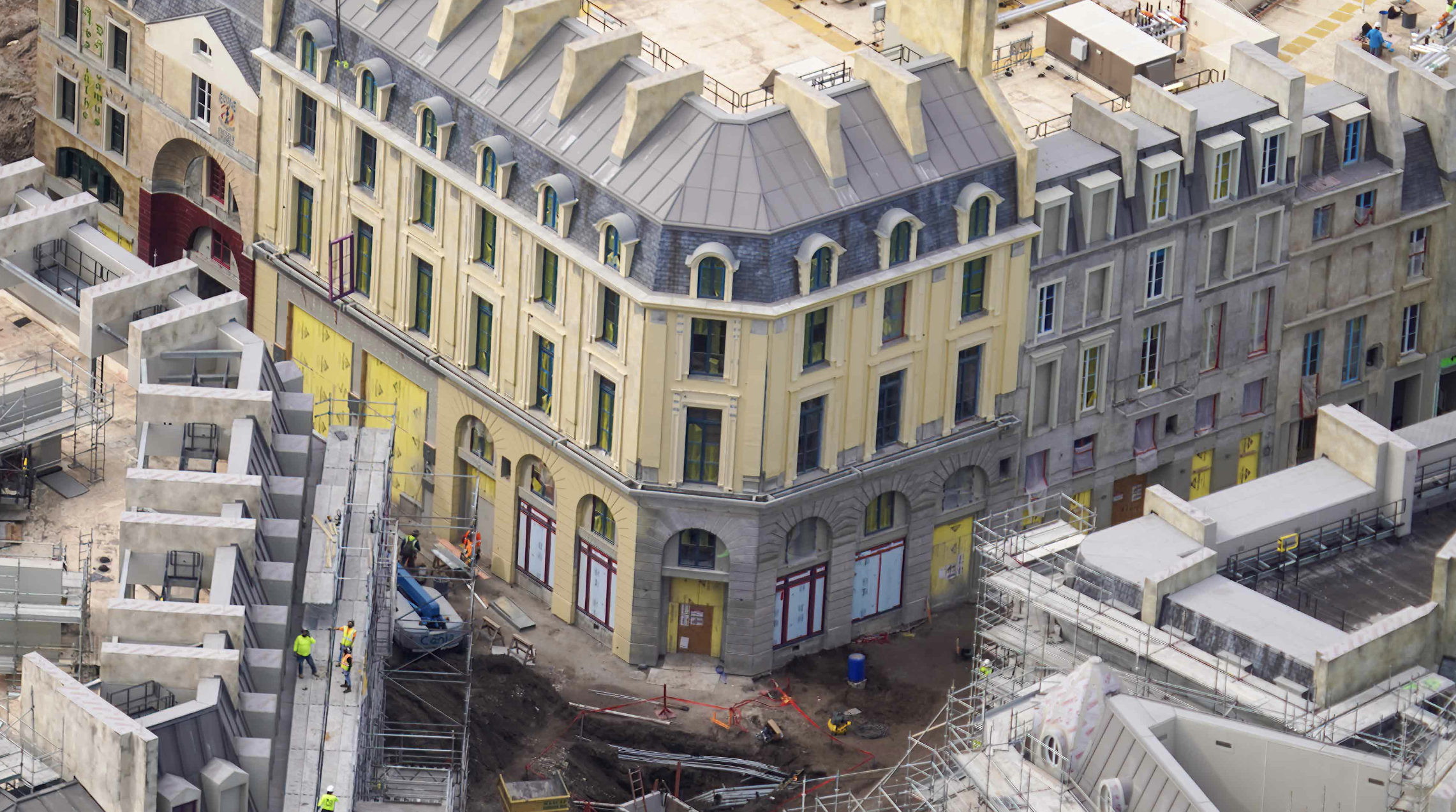 The aerial photos also give us an idea of the building styles we can expect at the new park. We knew the park would take inspiration from 1920s Parisian designs and architecture, with elements of the iconic British Ministry of Magic. Scaffolding around some buildings has been taken down, so we can now finally see what that looks like in reality. We’ve also got some pictures of other buildings, including the Porte Saint-Denis arch and a street corner with a detailed stone entrance.