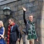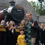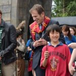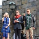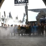 A small stage was set up on the left side of the entrance gate to Hogsmeade and the first person to come up to give a speech was the president of USJ, Mr. Glenn Gumpel. Next came Evanna Lynch who portrayed Luna Lovegood and Tom Felton who portrayed Draco Malfoy in the Harry Potter movies. After a short speech by Evanna and Tom, the three took their wands out and got ready for the big reveal. They pointed their wands up and at the count of three they shouted, “Revelio!” massive cloud of white smoke erupted out of nowhere and filled the air, hiding the entrance to Hogsmeade. As the smoke dissolved, we were greeted by characters from the Harry Potter world (Hogwarts, Beauxbatons and Durmstrang students in their uniforms, the Hogwarts Express conductor and more).