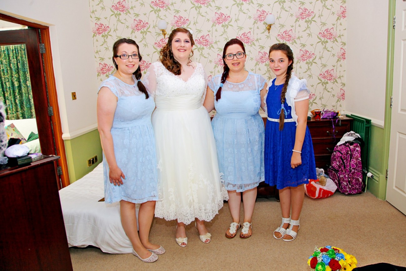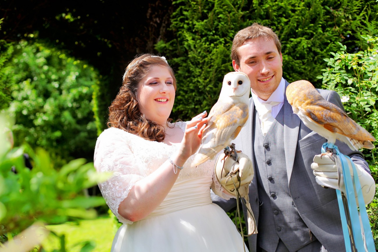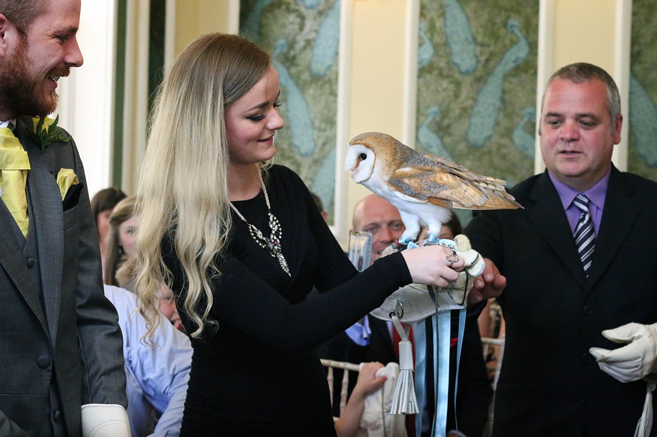 When the time came, I walked down the aisle to ‘Hedwig’s Theme’ and couldn’t stop smiling. Seeing James waiting there for me was the best moment. We had a surprise guest bringing in our wedding rings, a beautiful barn owl called Darcy. It was terribly hot in that room, and she didn’t have much fun flying, but we got the rings in the end! We all posed with Darcy and Hera for some lovely unique pictures afterward.