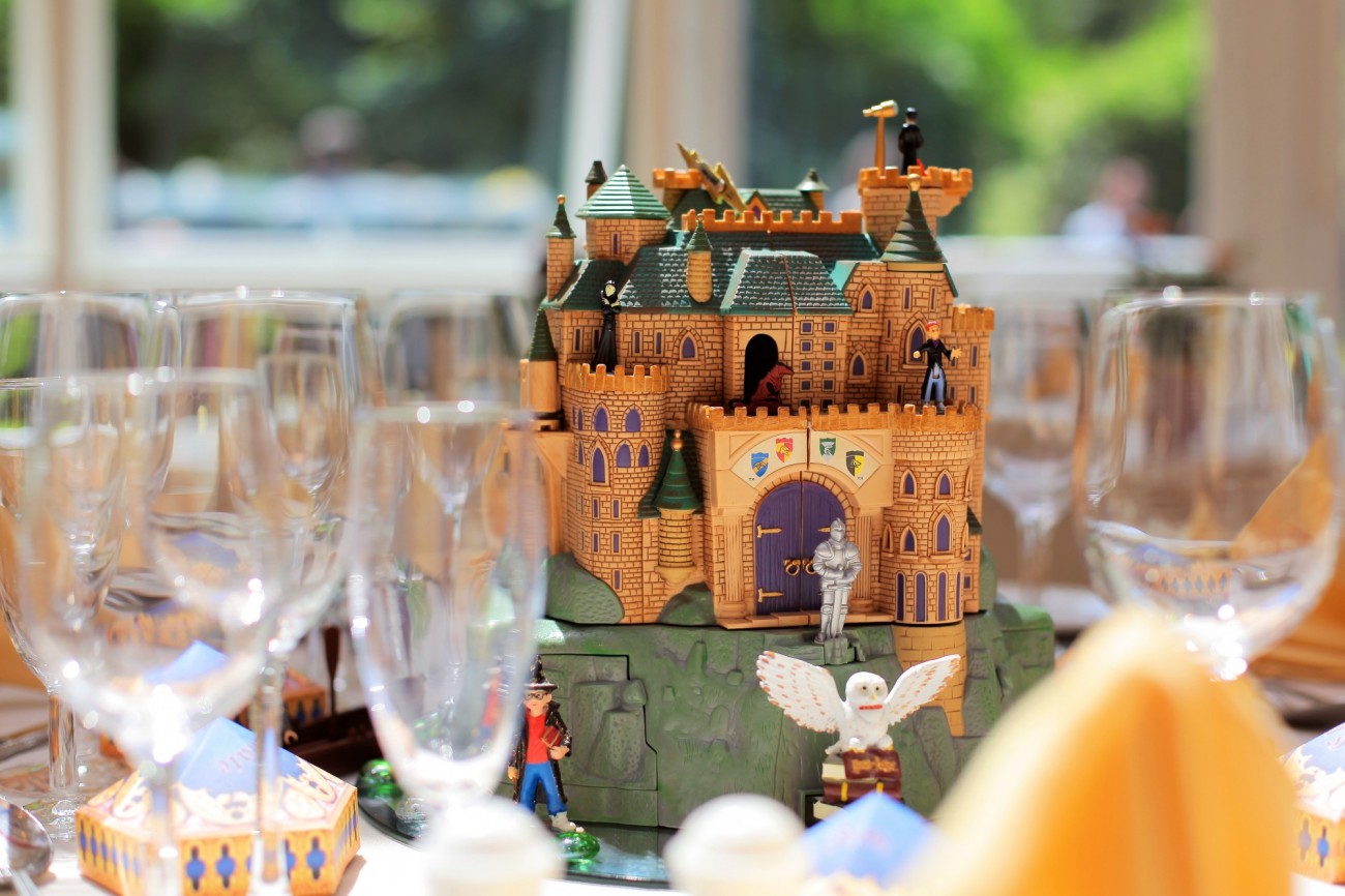 On tweaking the appearance of the venue itself, Katy was determined to strike the right balance between tasteful and paying homage to the series. To do this. she amped up aesthetics that would already be present at a typical wedding and updated them to match the color and symbolic themes from the books. “Here Comes the Bride” was replaced with “Hedwig’s Theme.” Seating arrangements were divvied up into Hogwarts houses. Wands accompanied place settings. The sumptuous Honeydukes buffet featured edible Dark Marks, Fizzing Whizbees, and Cockroach Clusters. There was even a giant chessboard stationed on the grounds that curiously had a few pieces missing, which made it all the better for guests who assumed roles in their very own Wizard’s Chess adventure.