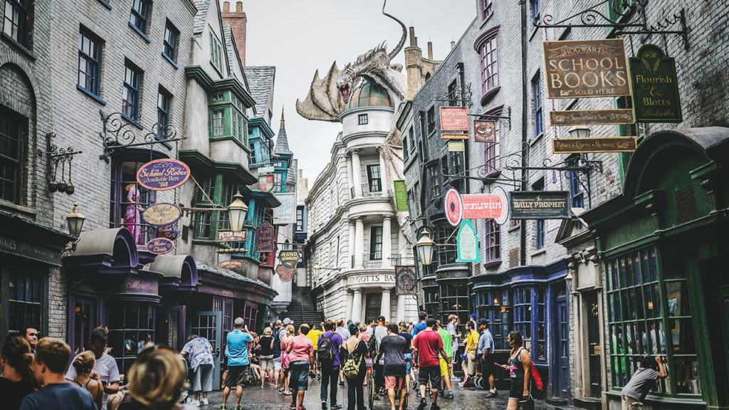 Harry Potter and the Escape from Gringotts: A thrill ride through the vaults beneath Gringotts Bank in Diagon Alley. The facade of the bank with its massive dragon is one of the most jaw-dropping sights, though don’t get too close…