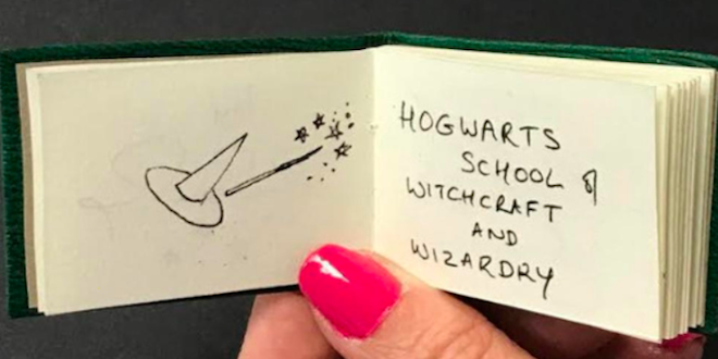 This rare and unique (and tiny!) piece of “Potter” history contains an excerpt from “Harry Potter and the Philosopher’s Stone” handwritten by J.K. Rowling.
