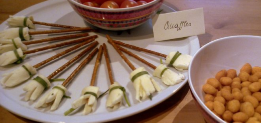 These adorable appetizers are perfect for a “Harry Potter” party or trivia night. The pretzel and cheese brooms will be flying off the plate!