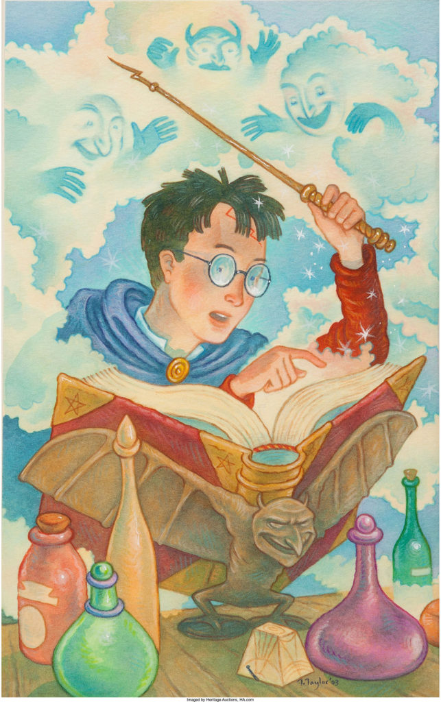 We have been fortunate to be able to offer various Potter lots over the past several years. Philosopher’s Stone turns up less often, maybe once every couple of years. Most of our auctions now have some grouping of Harry Potter titles, often signed by J.K. Rowling and sometimes with original art in the book.