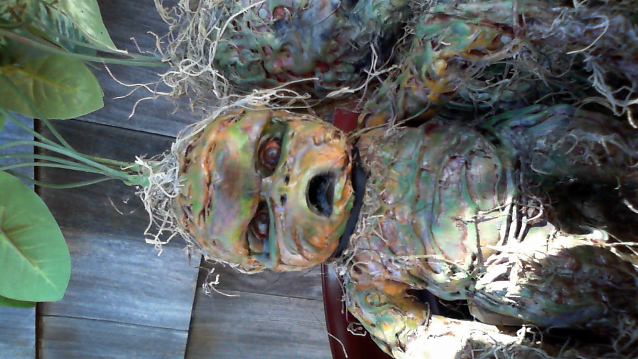 Step 5: After the glue hardens, paint the baby with a wash of brown (a light red-brown muddy color), then make the roots darker until the ends are black. Add details next: Give the eyes a slight grey wash, and create a black shadow around the eyes and in the mouth cavity, shaping it with the paint. I added various green-toned highlights all over the baby, but still showed mud and some little tufts of moss here and there. These creatures are pretty ugly, so there is no wrong way to make yours – the baby doll shape is what makes them look so accurate.